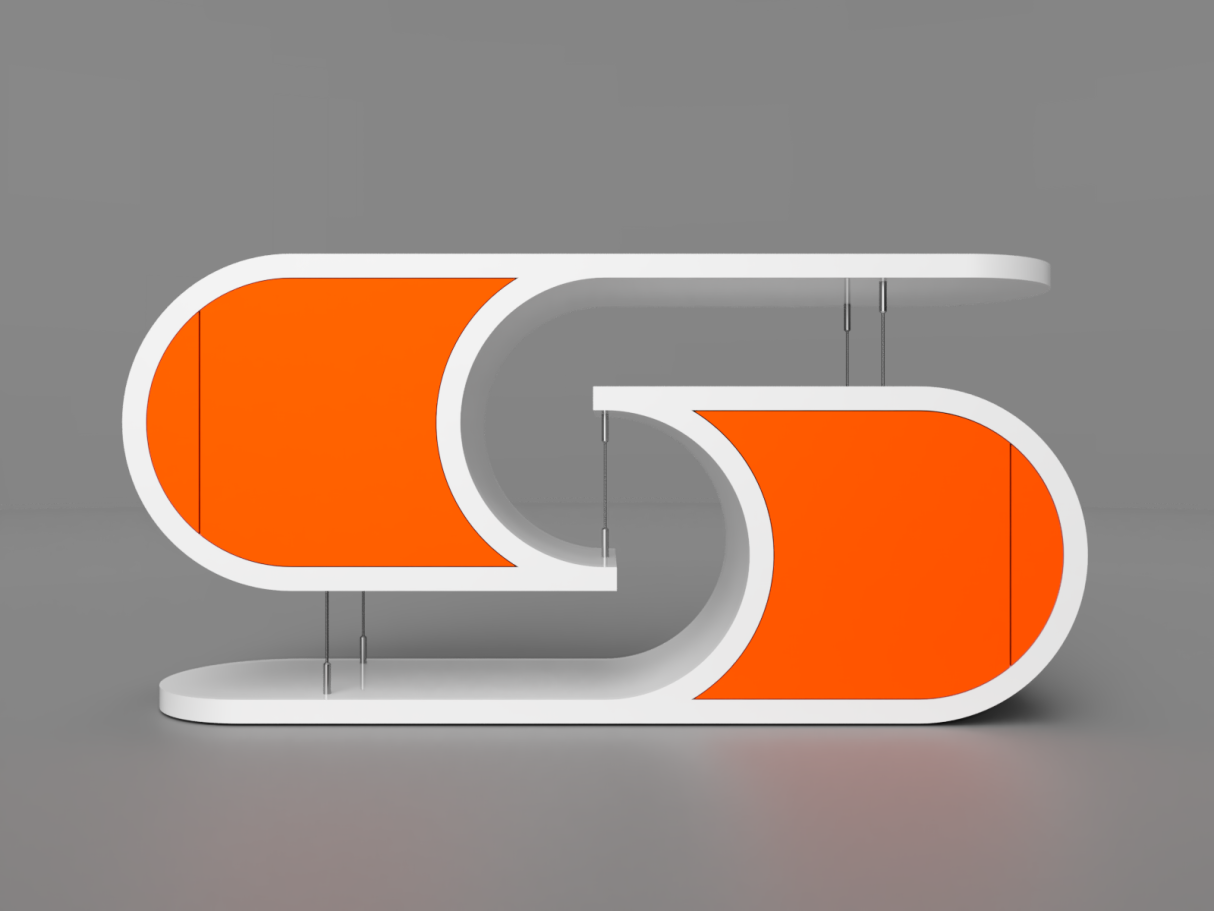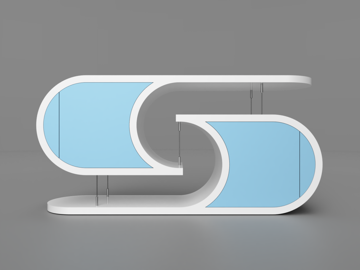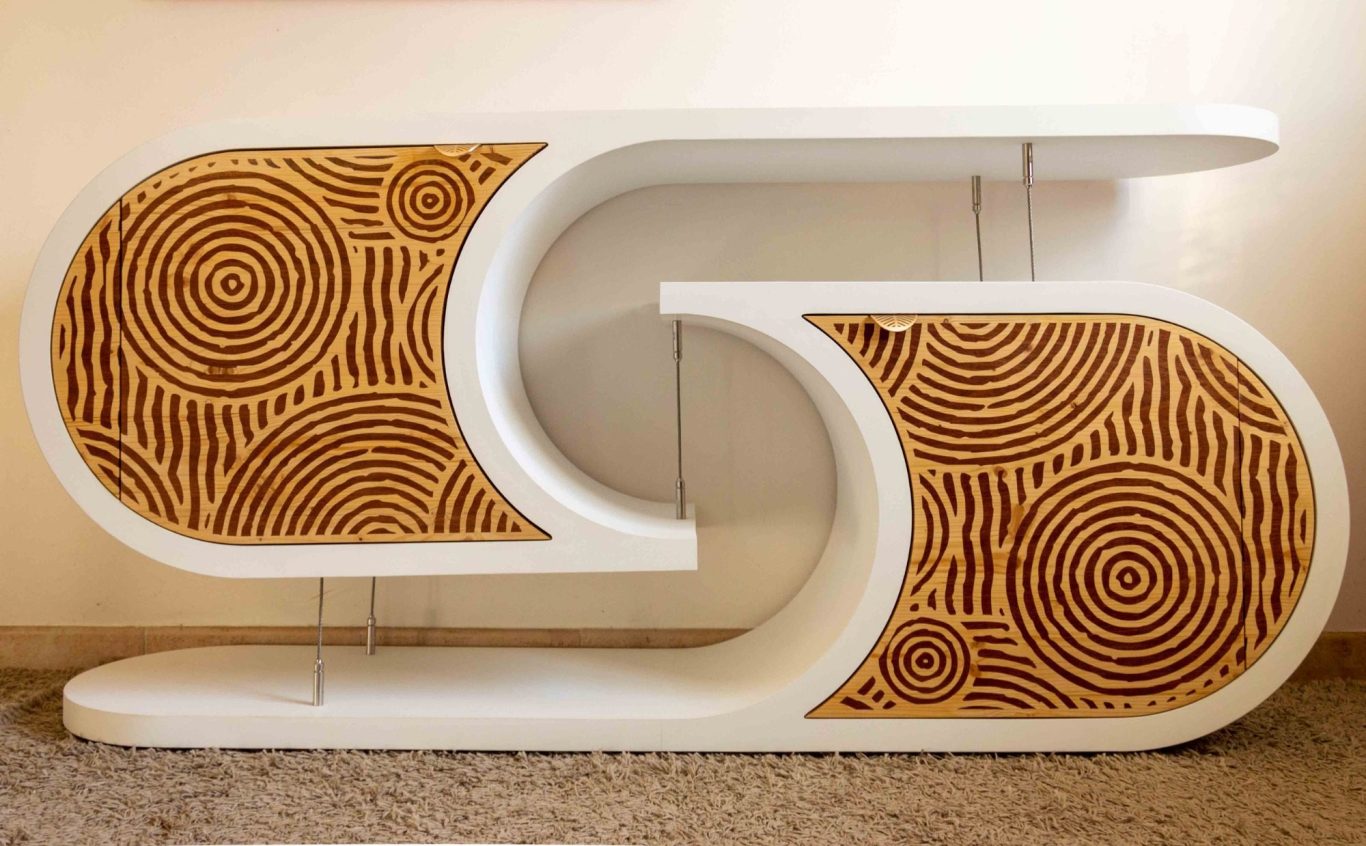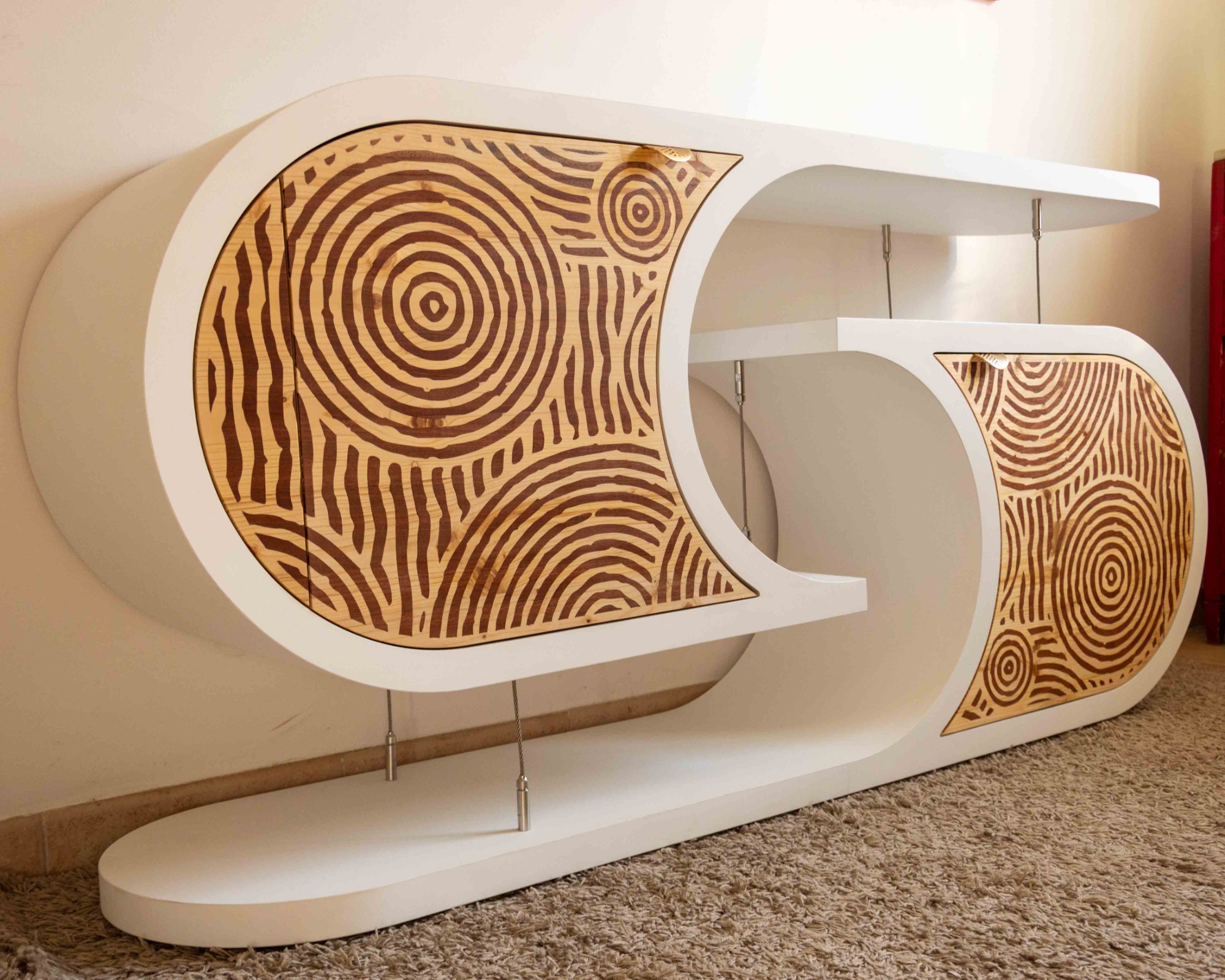 Je suis ravi de vous présenter mon meuble en tenségrité. Avec sa forme atypique et son jeu de câbles, il attire le regard et questionne les plus curieux sur le procédé qui permet aux deux éléments massifs de s'imbriquer sans se toucher.