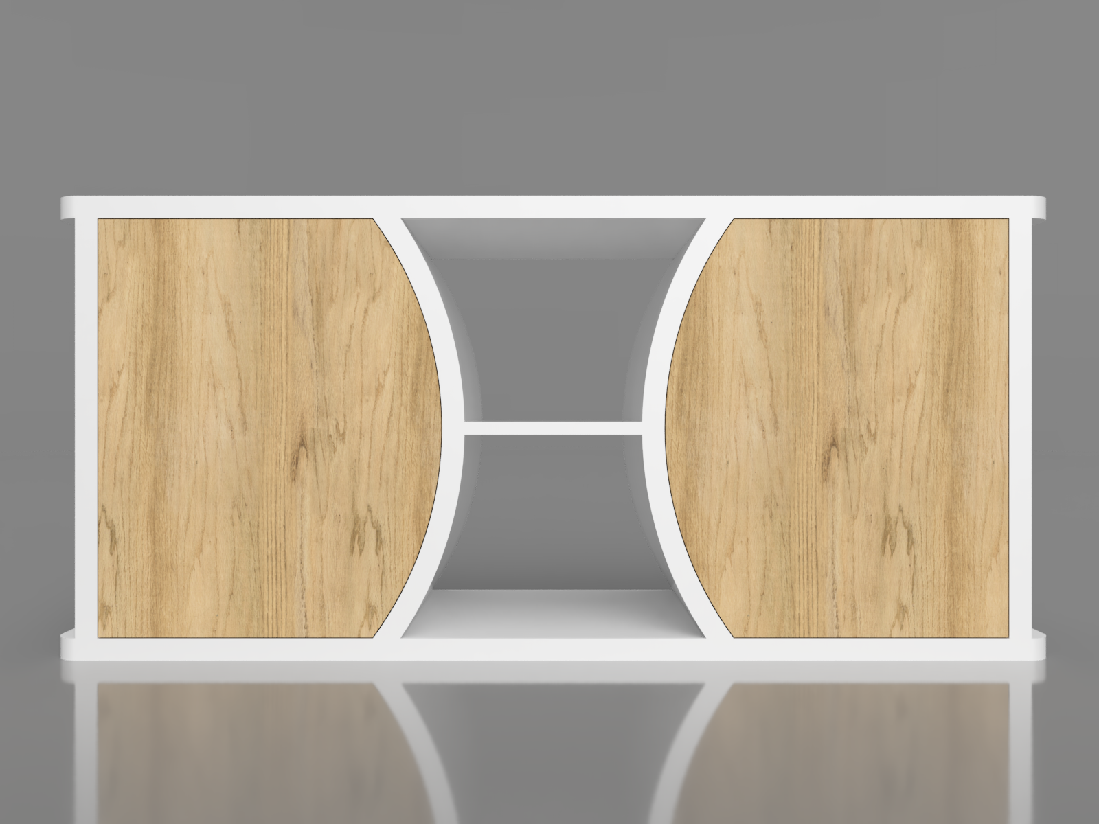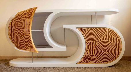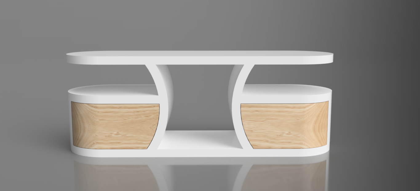 Avec sa forme épurée, ce meuble va à l’essentiel. L’élément du haut, tenu par sa structure arrondie et symétrique, semble se détacher du reste du meuble, créant ainsi une impression de plusieurs meubles en un.