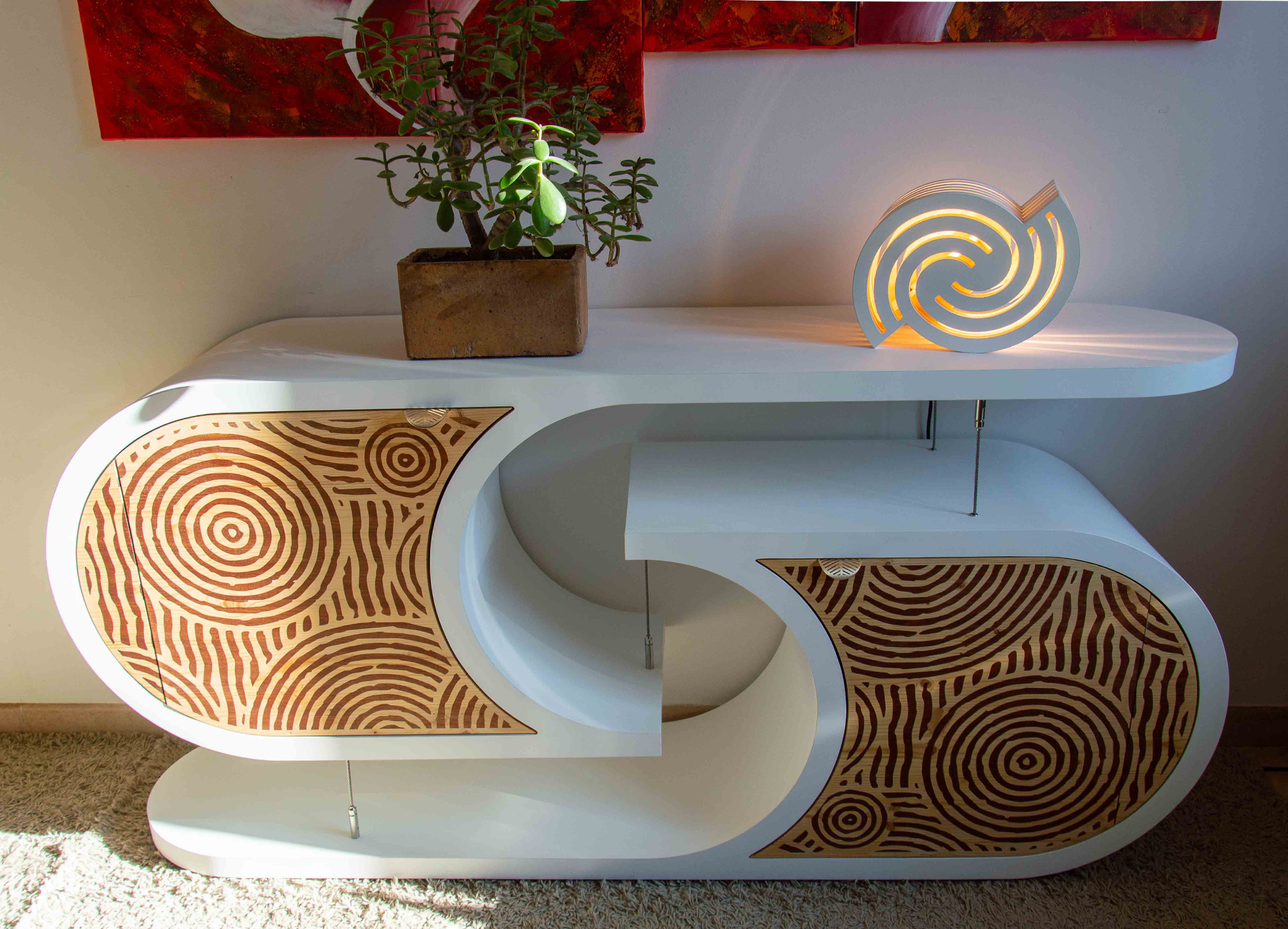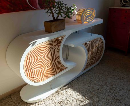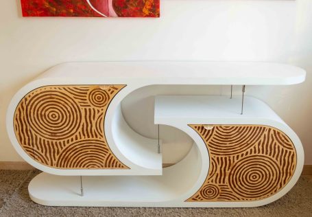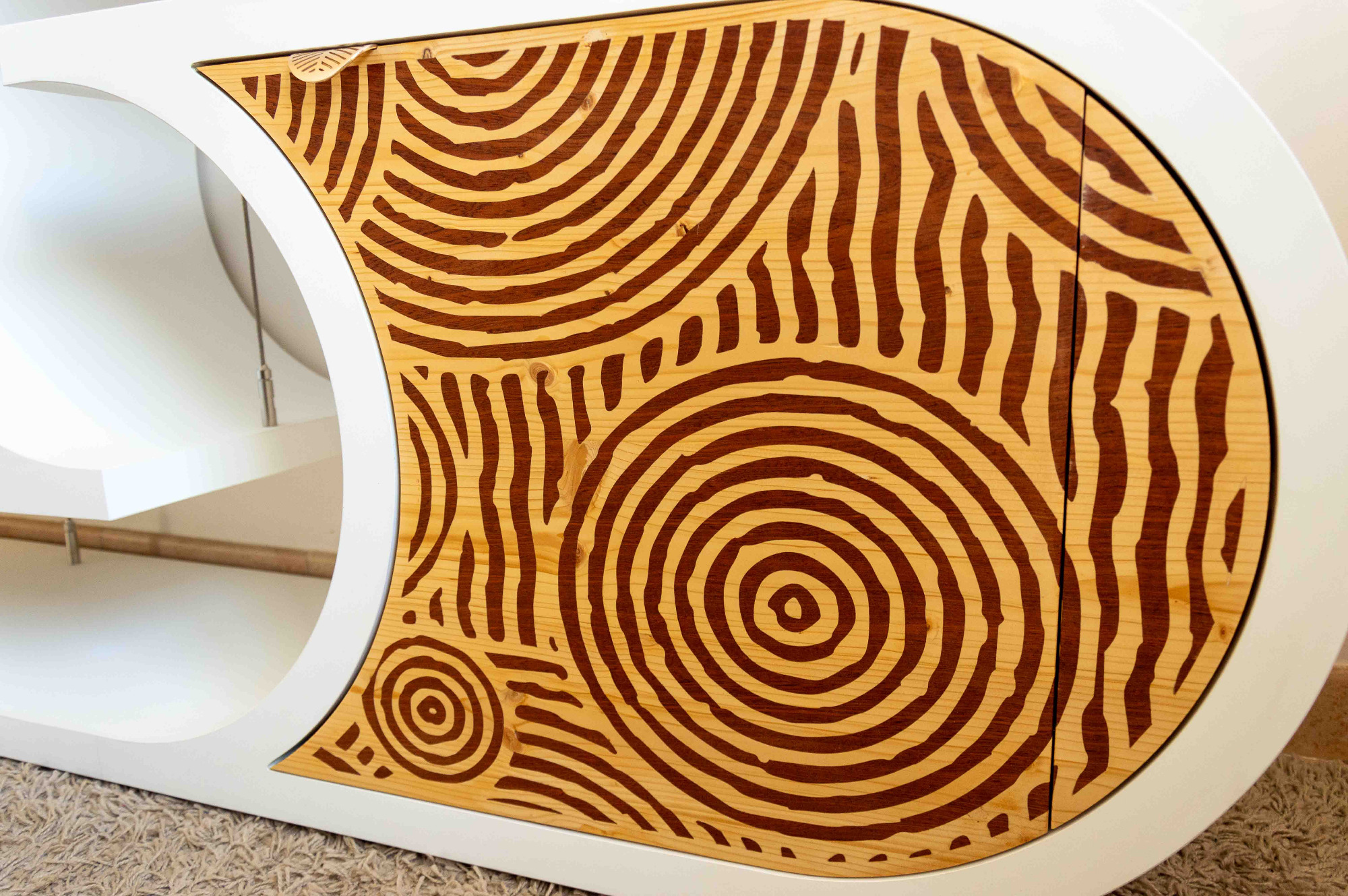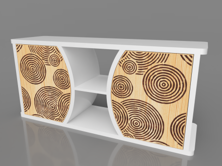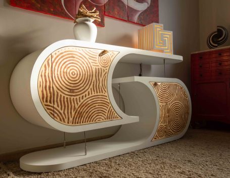 L’incrustation de bois sipo exotique dans le bois épicéa apporte naturellement de la couleur et de l'harmonie au meuble. Les formes circulaires rappellent les jardins zen du Japon. Les portes sont équipées d’un système de fermeture douce, avec des charnières blumotion qui s'ouvrent à 155°.