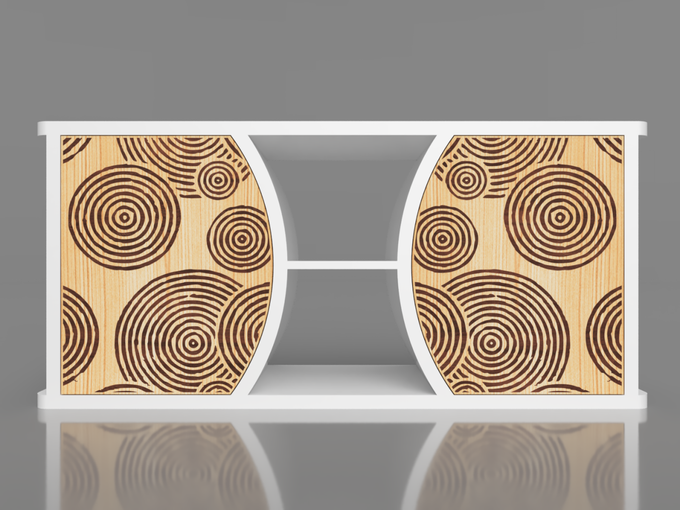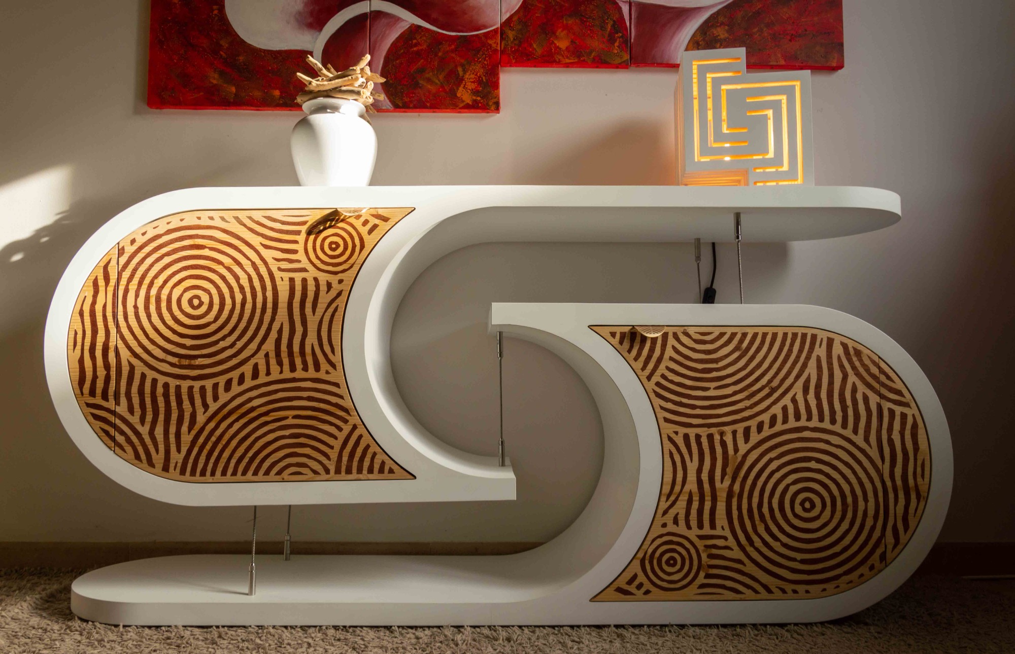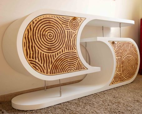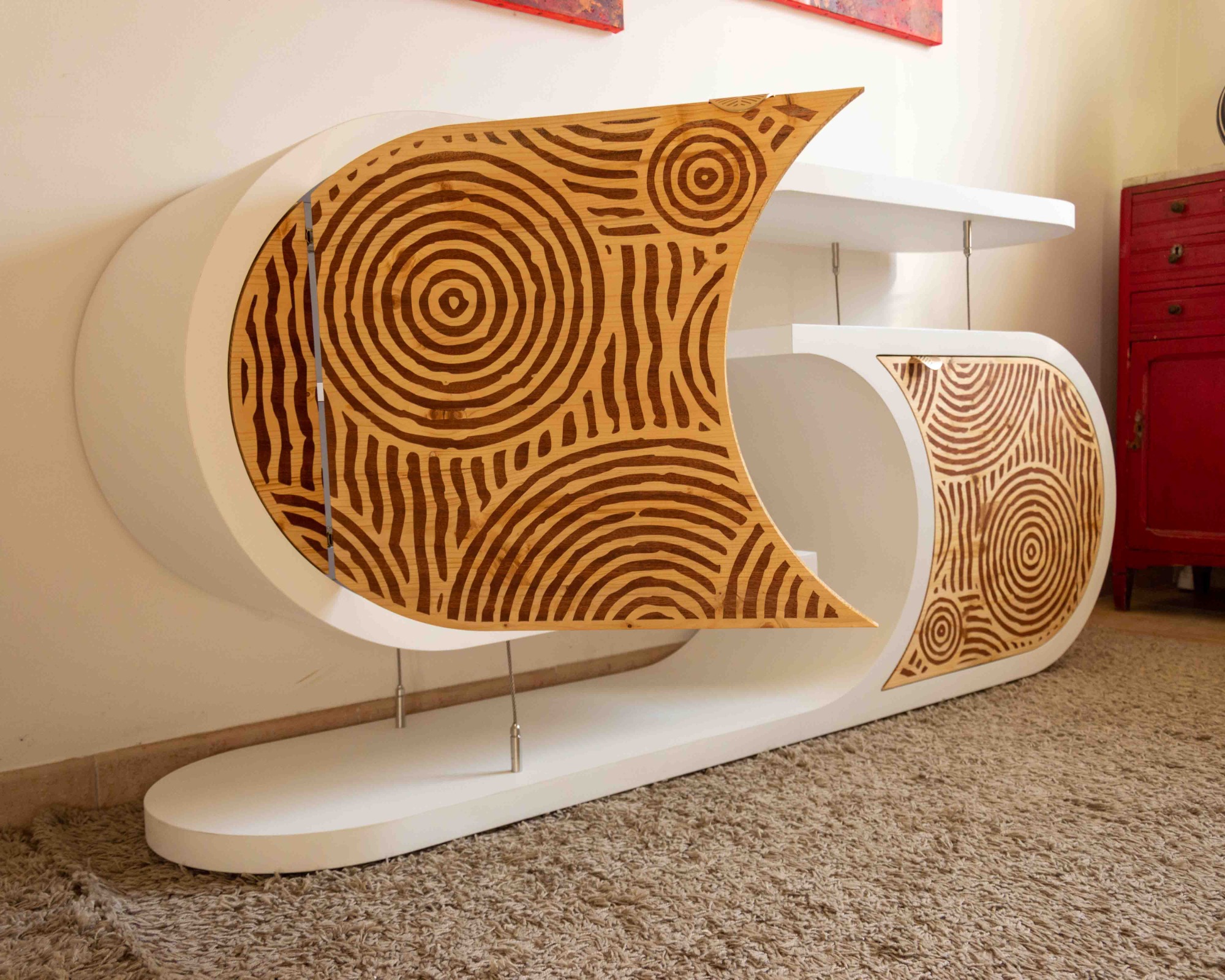 L’incrustation de bois sipo exotique dans le bois épicéa apporte naturellement de la couleur et de l'harmonie au meuble. Les formes circulaires rappellent les jardins zen du Japon. Les portes sont équipées d’un système de fermeture douce, avec des charnières blumotion qui s'ouvrent à 155°.