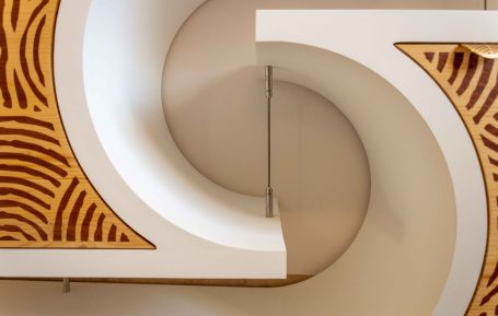 Invisible, toute la structure est conçue avec du bois épicéa. Le panneau de base est constitué de trois couches, chacune collée perpendiculairement aux autres. Il améliore la stabilité et le risque de déformation.