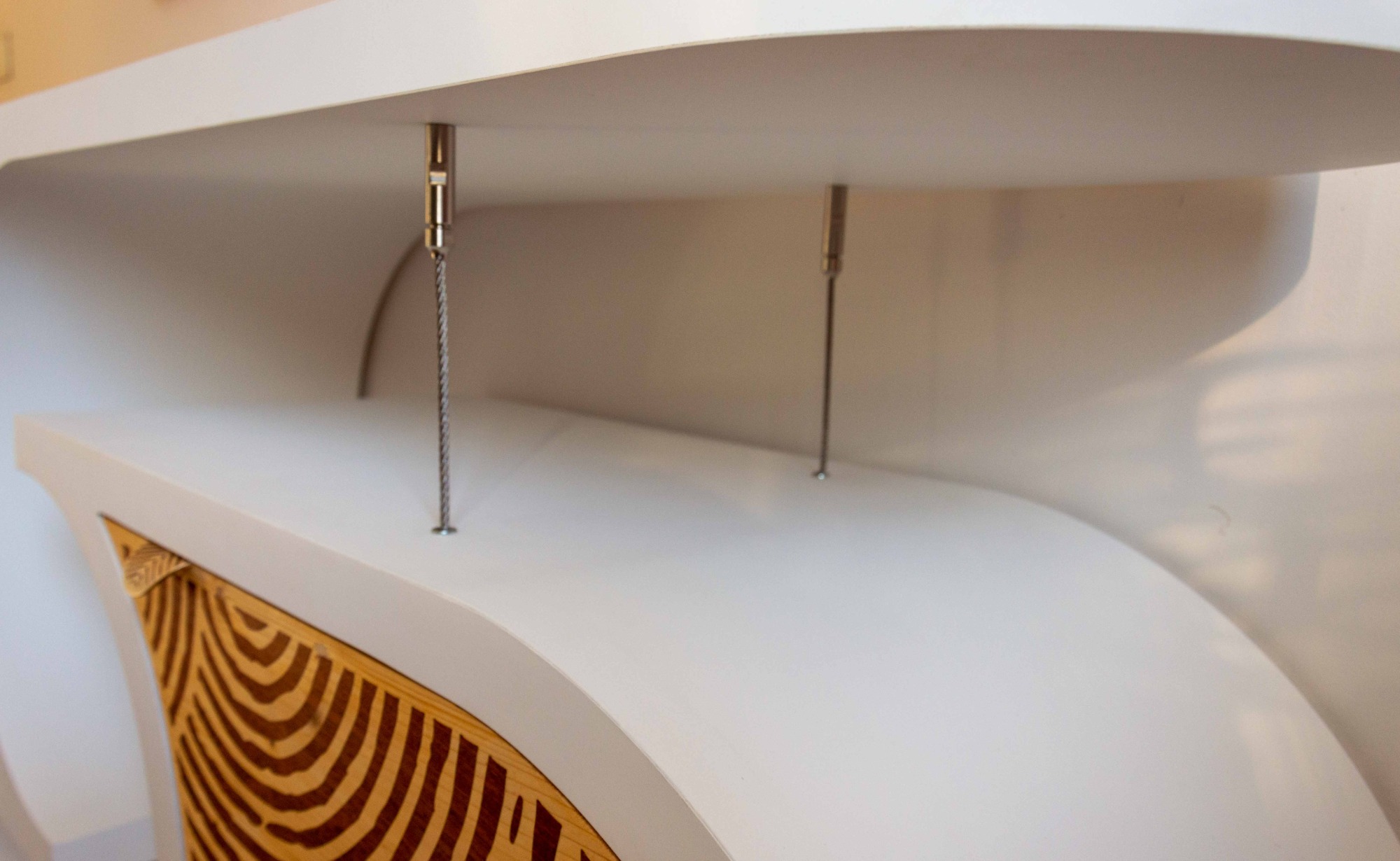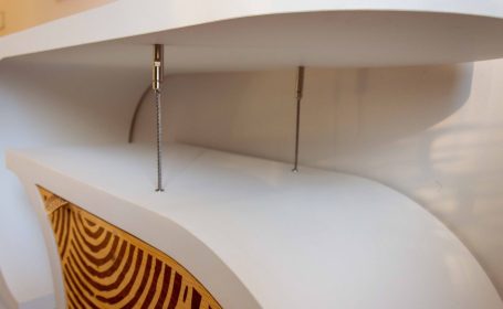 Pour créer la particularité de ce meuble en équilibre, et en léger mouvement, il a fallu chercher les câbles adaptés et le meilleur système de serre câbles pour garder à la fois l'esthétisme et l'efficacité. Ces câbles inoxydables restent discrets. Pourtant, leurs tensions et compressions sont les pièces maîtresses du meuble car elles contribuent au fonctionnement de la tenségrité